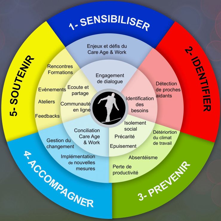 Pour intervenir sur la thématique des proches aidants en entreprise de manière efficace et efficiente, nous avons élaboré et conçu une méthode d’intervention SIPAS (Sensibiliser, Intervenir, Prévenir, Accompagner, Soutenir).